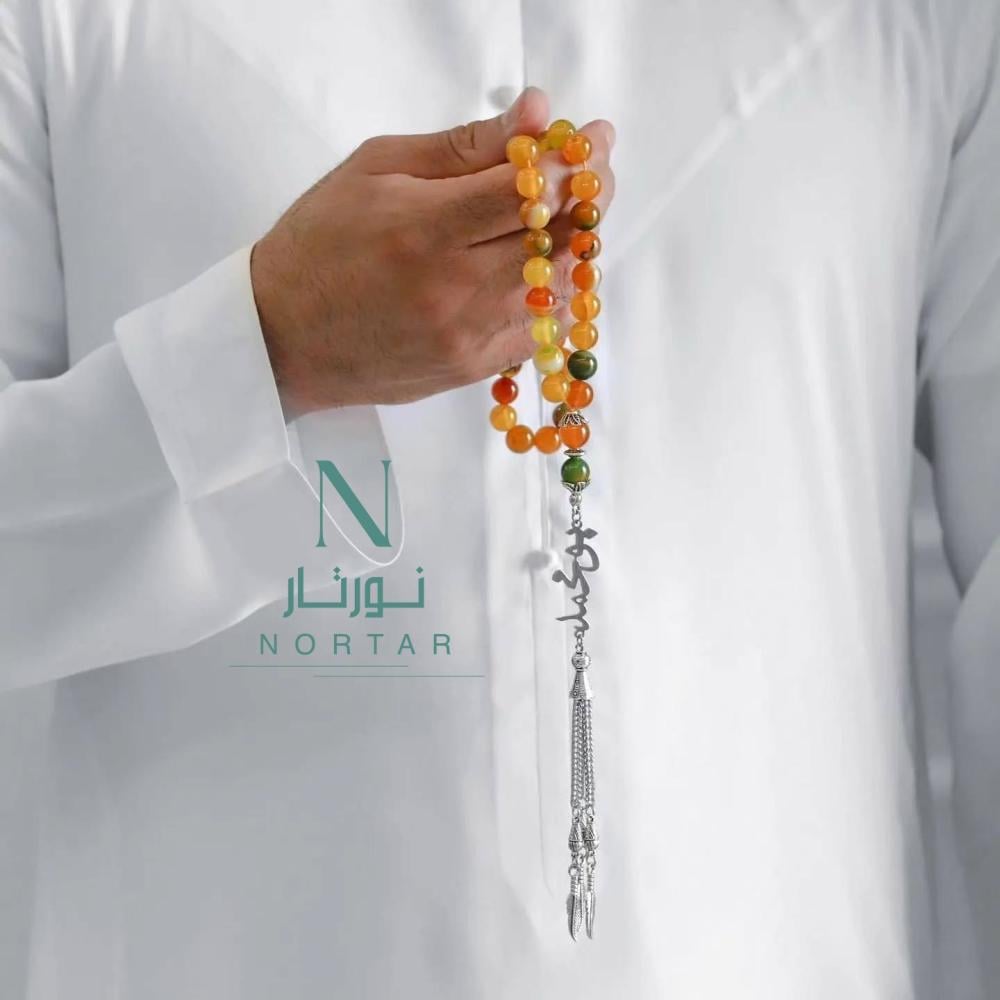سبحة بالاسم من العقيق بطلاء فضي وبتصميم ناعم ومميز حسب الطلب. أفخم سبحة وهدايا رجالية مصنوعة بكل حب من نورتار